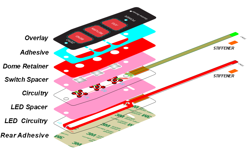 Electrical or circuit layer in a membrane keypad is usually made with: PET - the most common and cost effective solution FPC - copper-based foil with high conductivity and bendability PCB - offering stiffness and possibility for soldering of components The choice of the most suitable circuit layer option for your keypad depends on use environment of the product, as well as the electrical and mechanical concepts of the keypad.